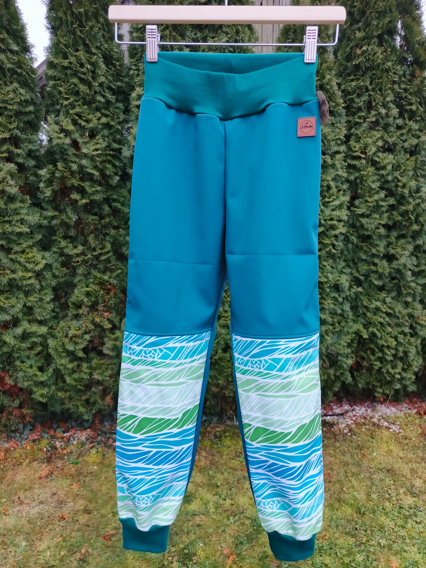 Ušité ze zimního softshellu s hřejivým fleecem s membránou. Pas a nohavice jsou zakončeny elastickým nápletem.