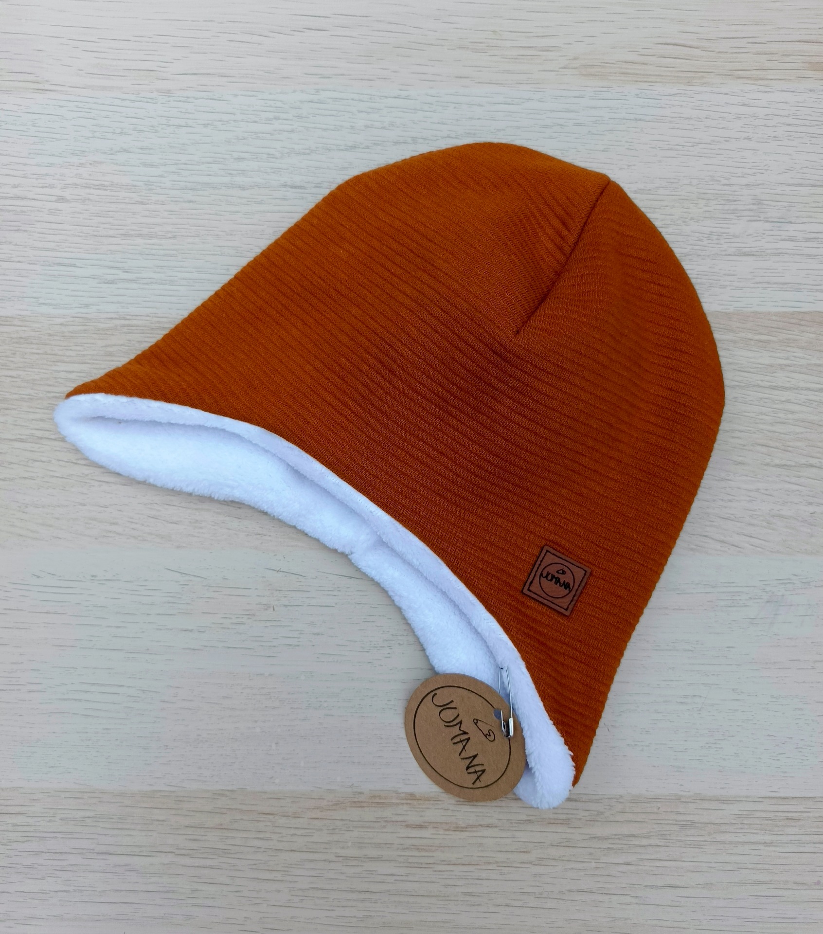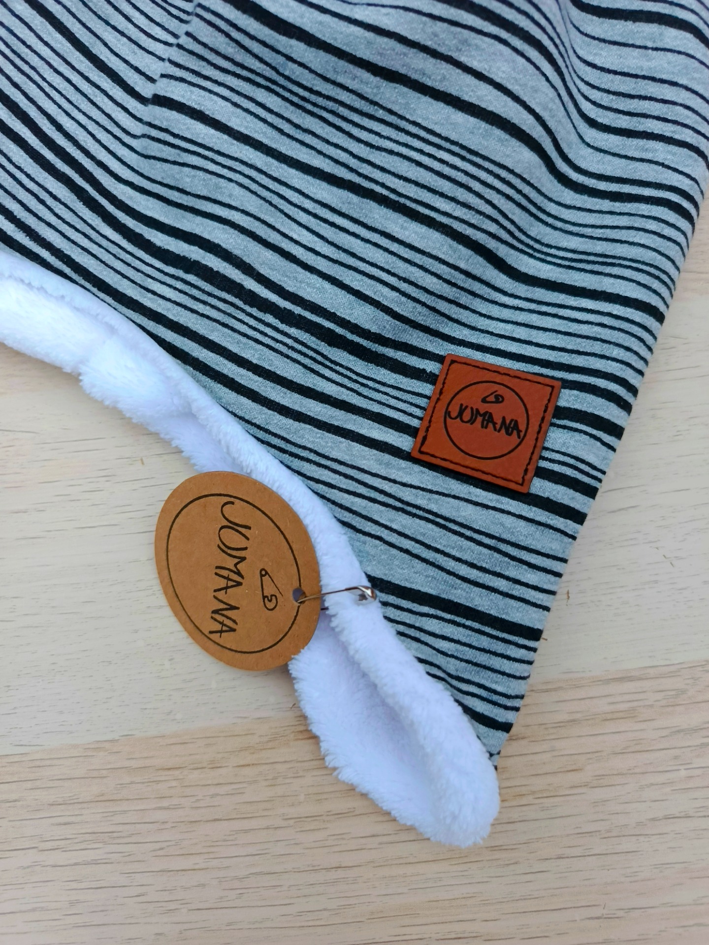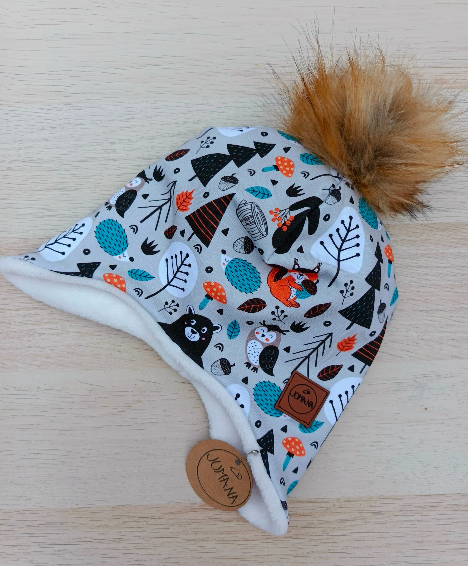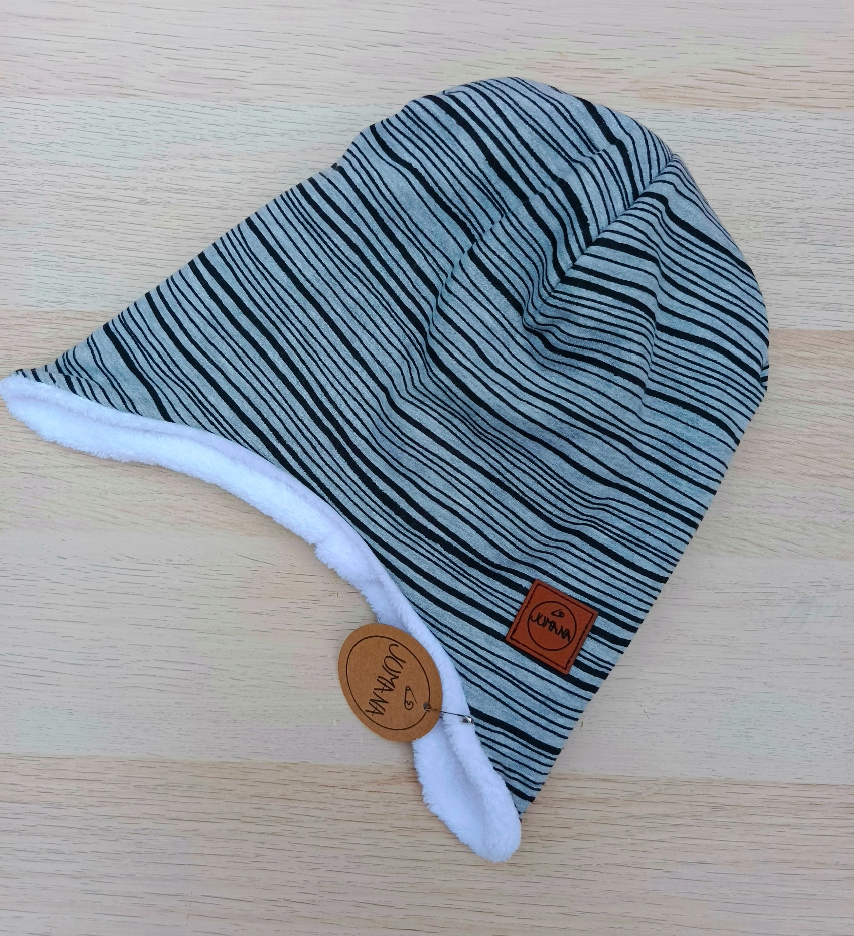 Čepice vyrobená z teplákoviny, úpletu a bavlněného fleecu. Fleece je velmi příjemný na dotek a hřejivý. Lze ušít s bambulí i bez bambule.