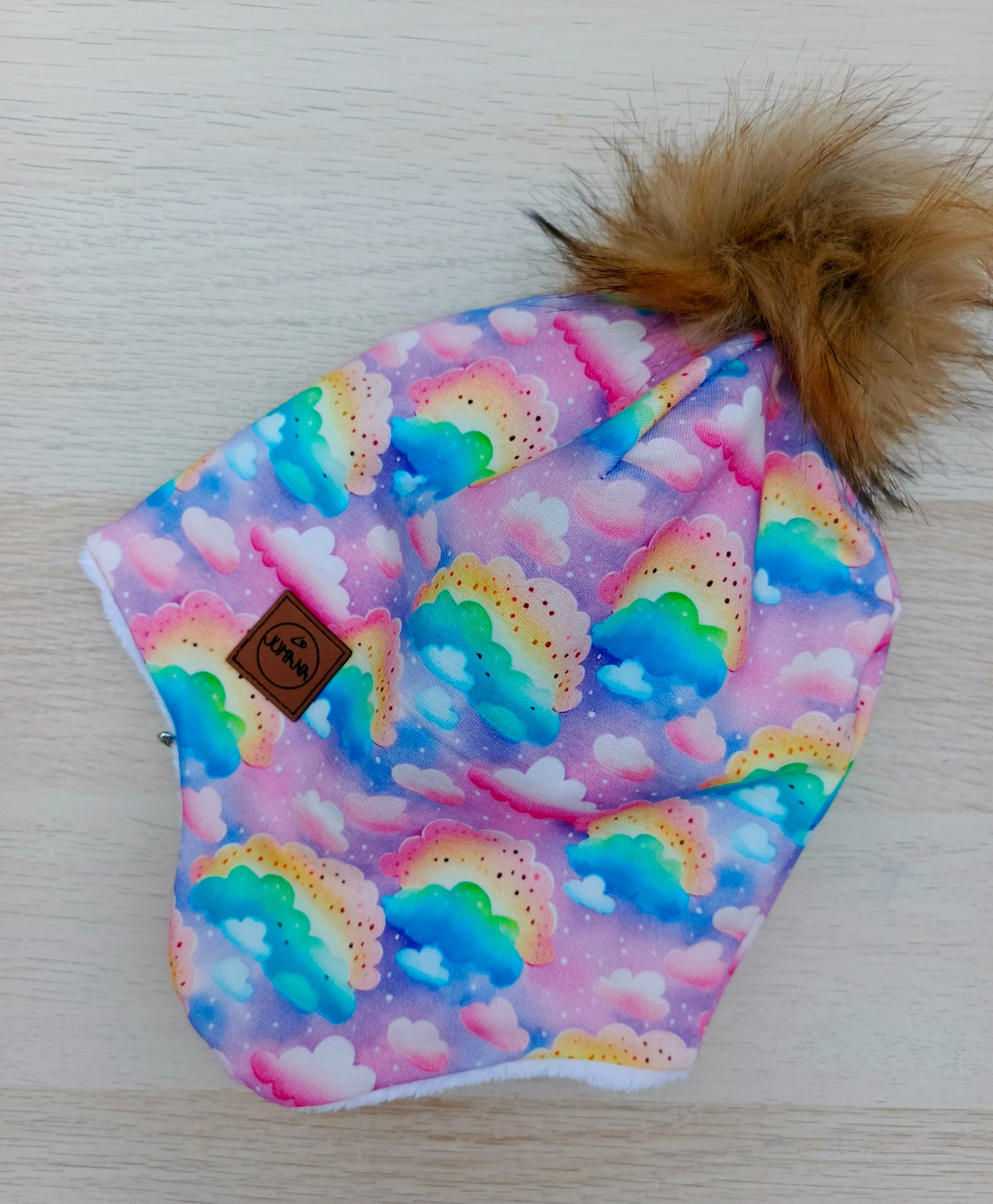 Čepice vyrobená z teplákoviny a bavlněného fleecu. Fleece je velmi příjemný na dotek a hřejivý. Bambule je připevněna gumičkou, která je navléknuta na knoflík, který je přišitý k čepici. Při praní lze bambuli sundat, tím prodlužujete její životnost. Možnost vyměnit za jinou barvu.